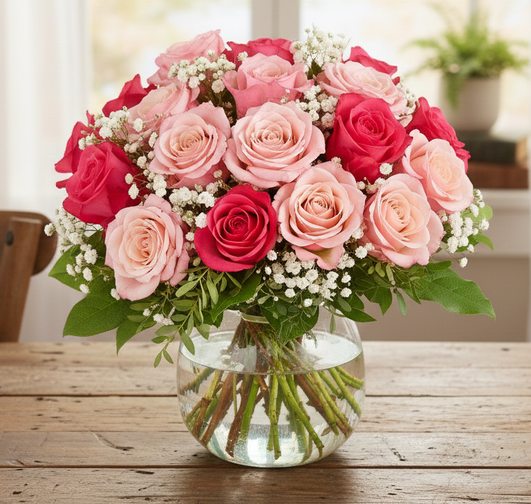 Ein eleganter Rosenstrauß in harmonischen Pink- und Rosatönen, der durch filigranes Schleierkraut und frisches Grün seine luftige Leichtigkeit erhält. Eine ausdrucksstarke Komposition, die zeitlose Eleganz und herzliche Freude perfekt vereint.